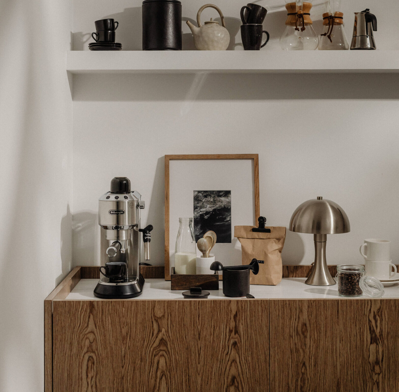 Your coffee station doesn’t need a custom counter or fancy shelves. Just create a small, tidy area with your essentials in one place.